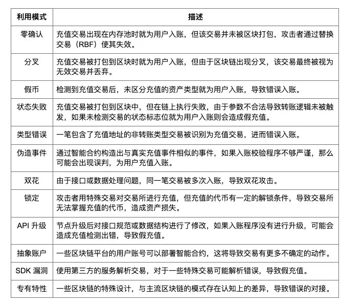 1. 零确认: 充值交易出现在内存时就为用户入账。但是该交易未被打包。用户通过替换RBF 使之失效。